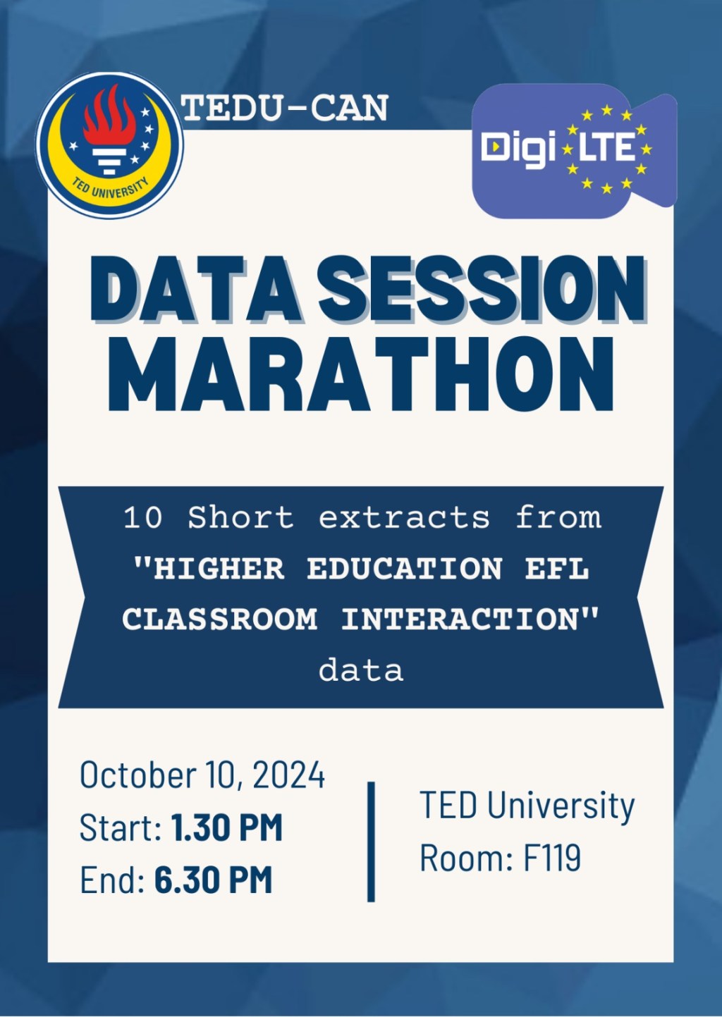 The TEDU-CAN Research Group is excited to invite you to a Data Session Marathon on October 10, 2024. We will be analyzing 10 short extracts from our DigiLTE project data, focused on “Higher Education EFL Classroom Interaction.” Date: October 10, 2024Time: 1:30 PM – 6:30 PMPlace: TED University, Room: F119